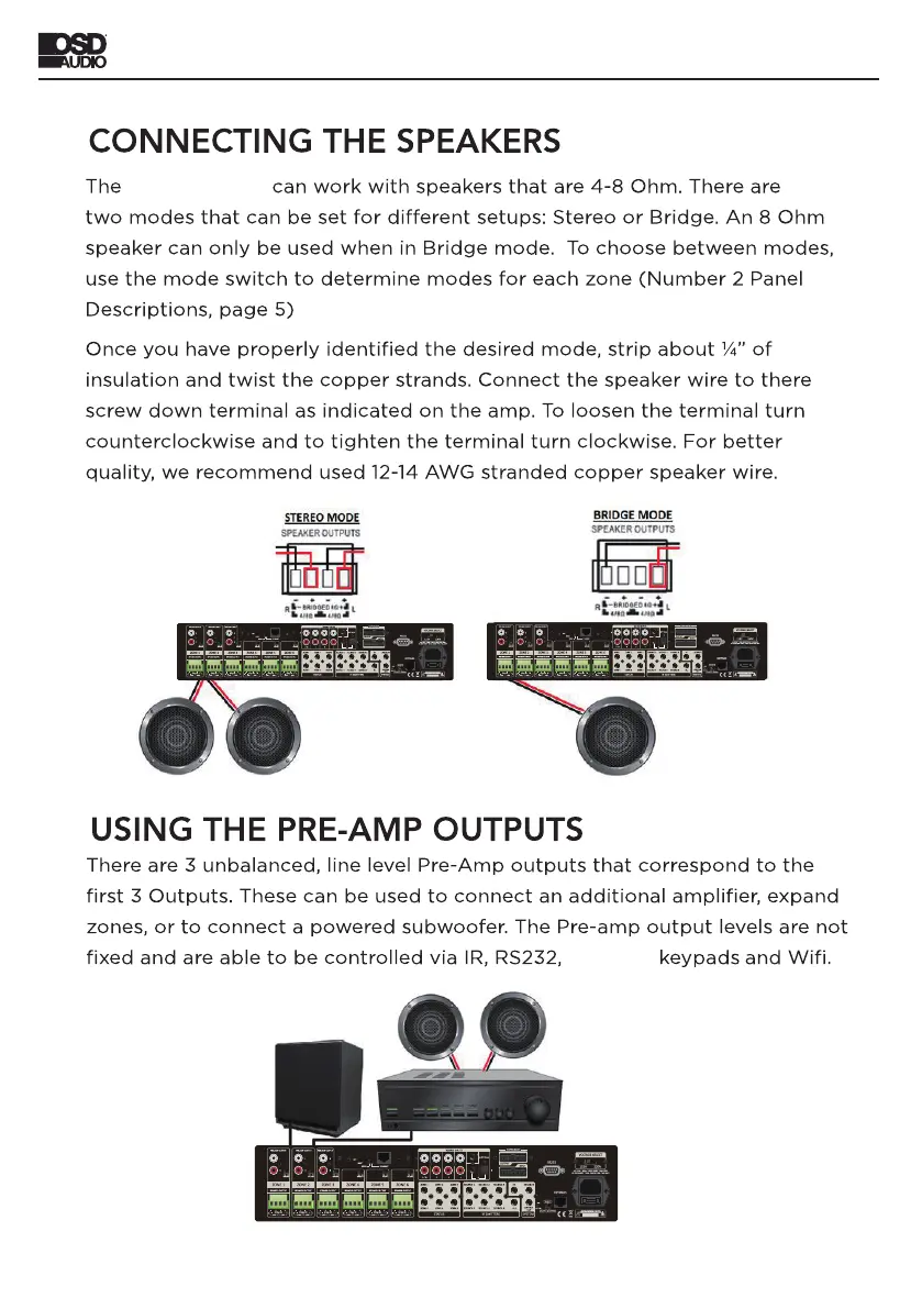 OSD Audio NERO MAX12 - Audio Output Configuration; Speaker Connection Modes; Pre-Amp Output Utilization