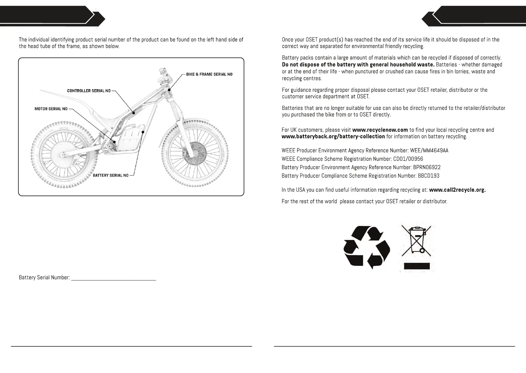 The bike, motor, battery and controller serial numbers can be found as shown in the diagram above.