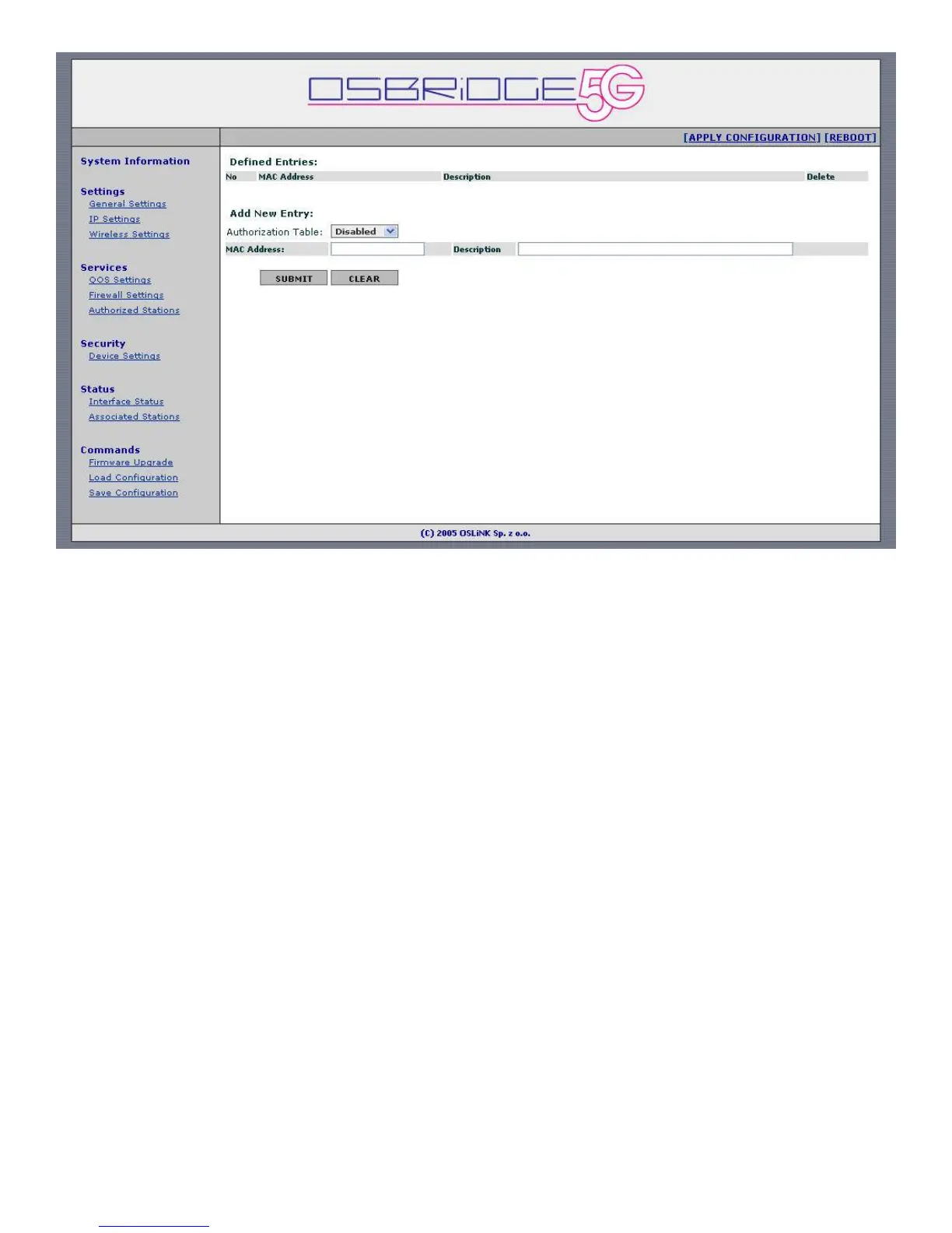 Authorized stations list, if the Authorization Table option is Enabled, defines MAC addresses of
