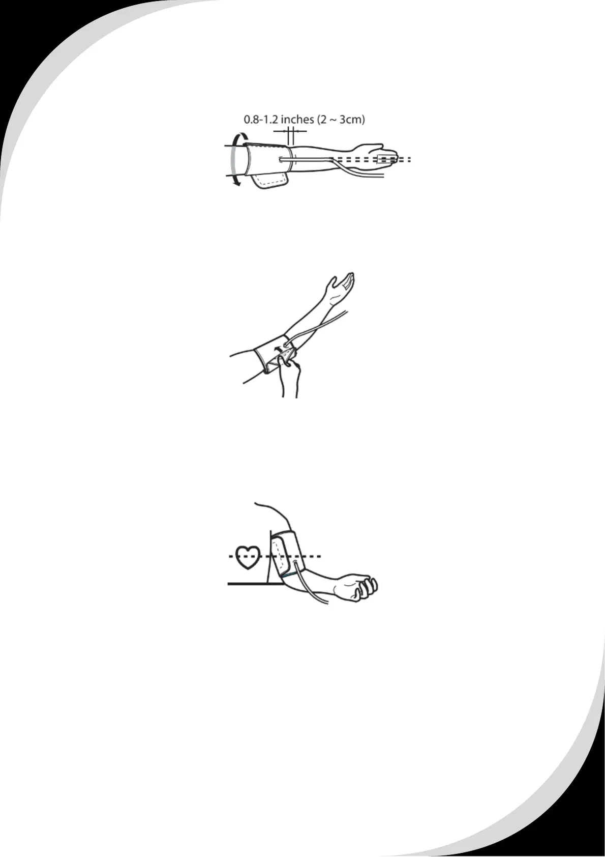 Make sure at least there should be 1-2 fingers space between arm and cuff.