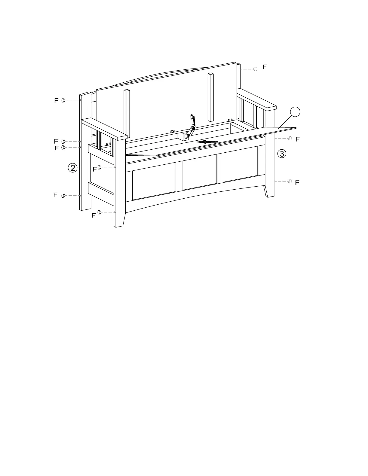 Cover holes in Left Side Frame (2) and Right Side Frame (3) using six Wood Plugs (F) for each side frame. Carefully place Bottom Panel (7) into assembly.