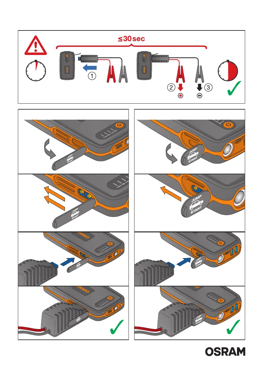 Osram BATTERYstart 200 - Detailed Jump Starting Steps and Indicators; Connecting Cables to the Device; Connecting Clamps to Battery Terminals