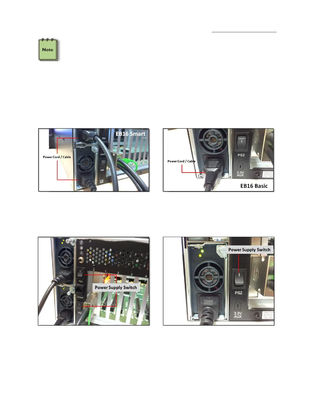 Connect the power cable to the power receptacle of the power supply located on the back of the unit. For EB16 Smart, you need two power