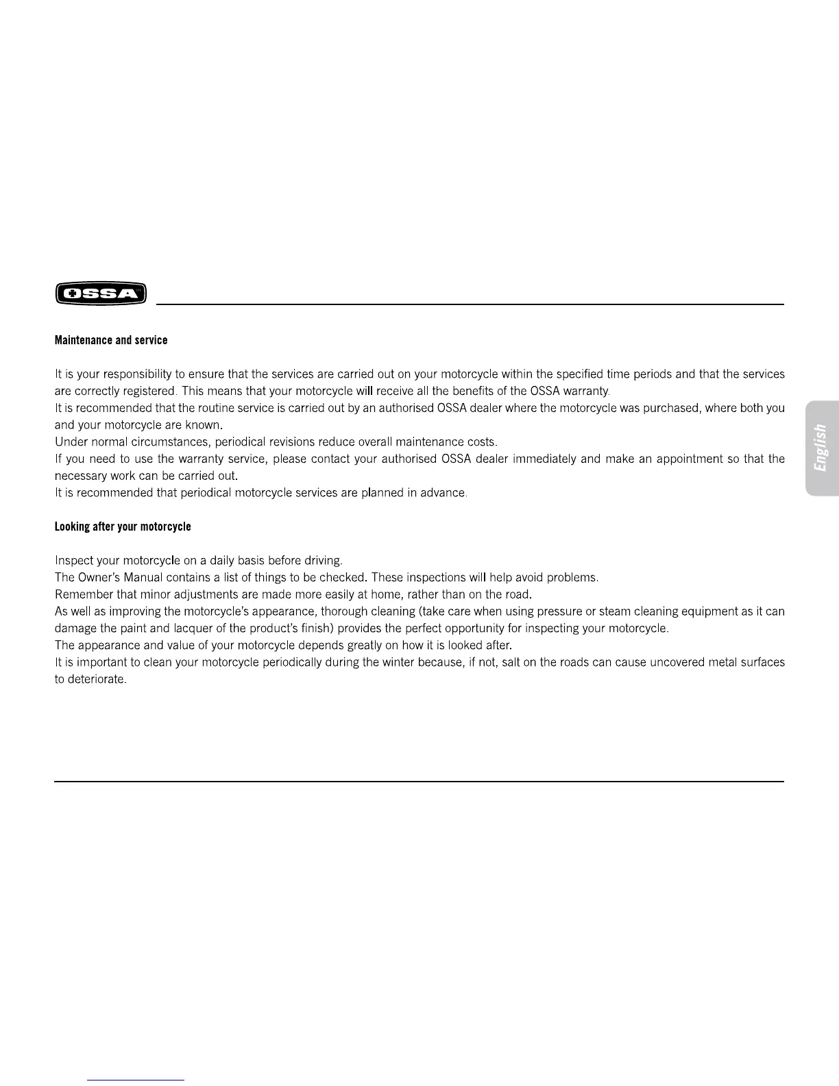 Ossa TR280i - Maintenance and service; Looking after your motorcycle