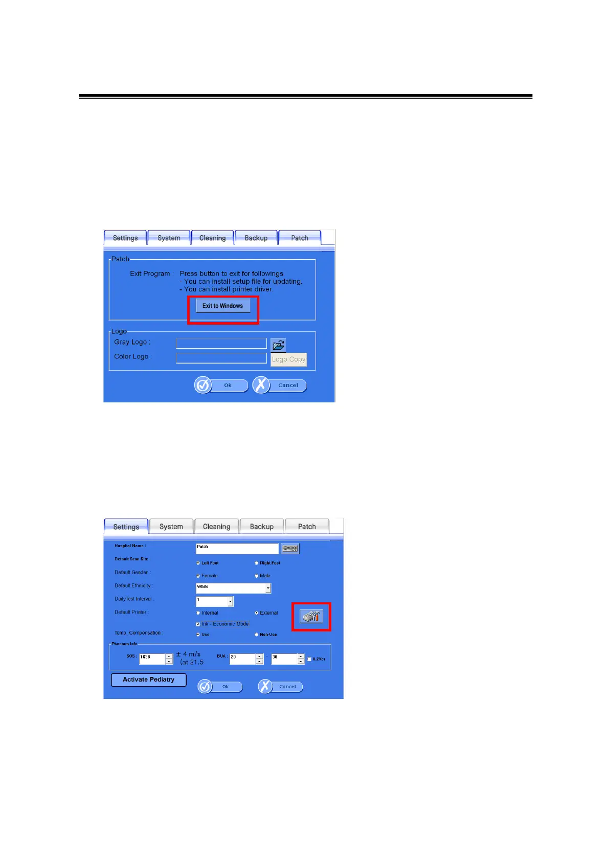 For the installation of printer driver, exit program (Setup > Patch > Exit to Windows)