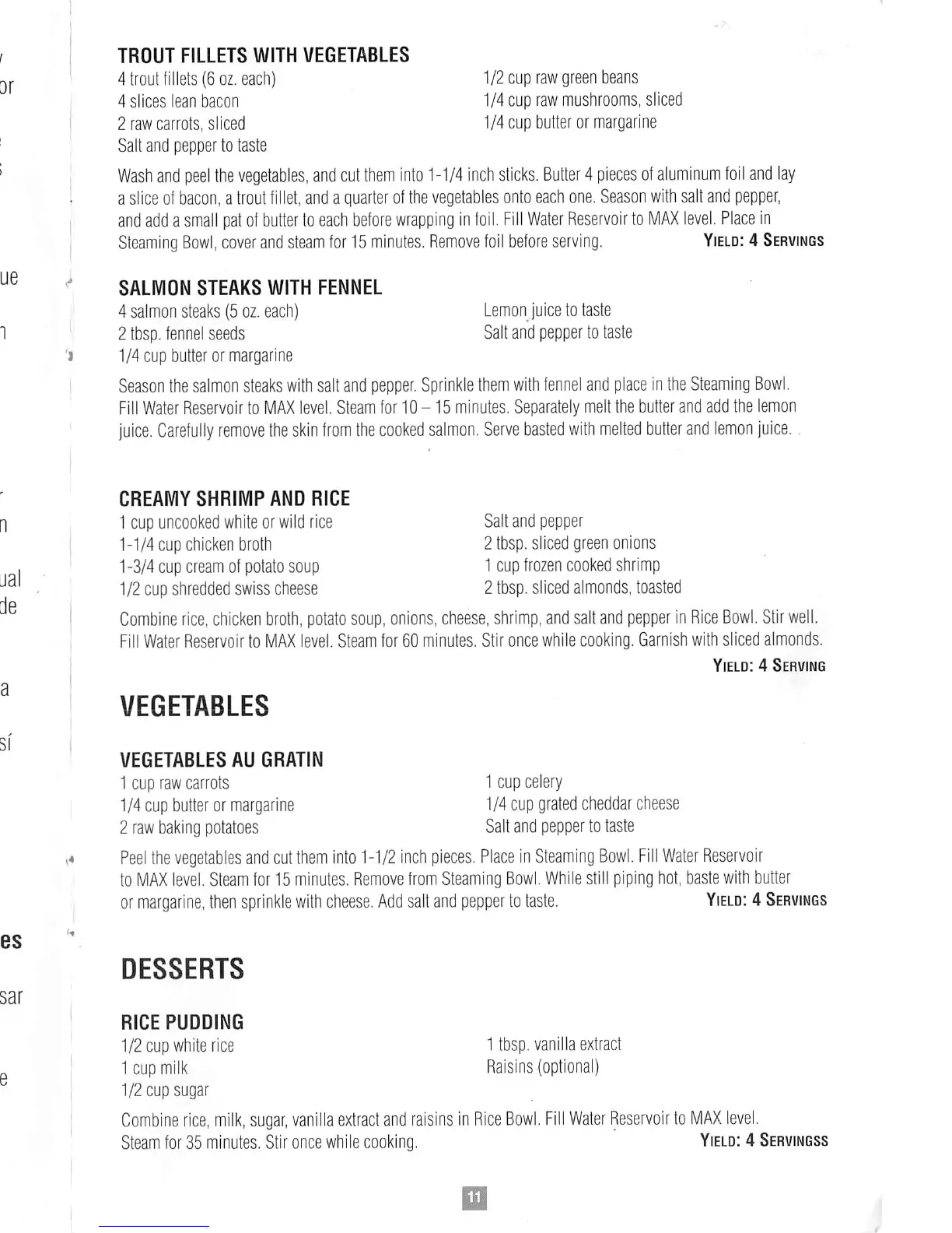 Oster 4714 - Steamer Recipes; Trout Fillets with Vegetables; Salmon Steaks with Fennel; Creamy Shrimp and Rice