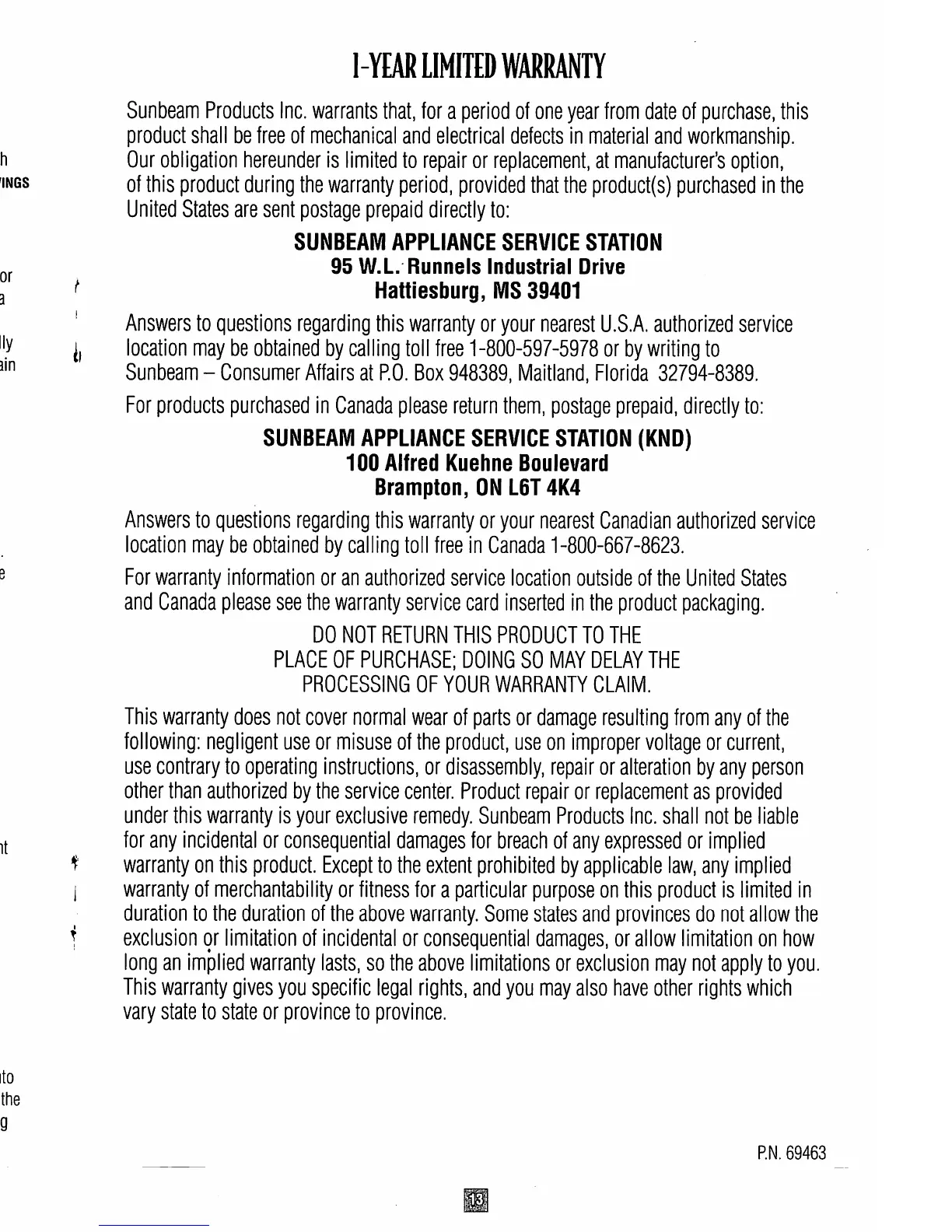 Oster 4714 - 1-Year Limited Warranty