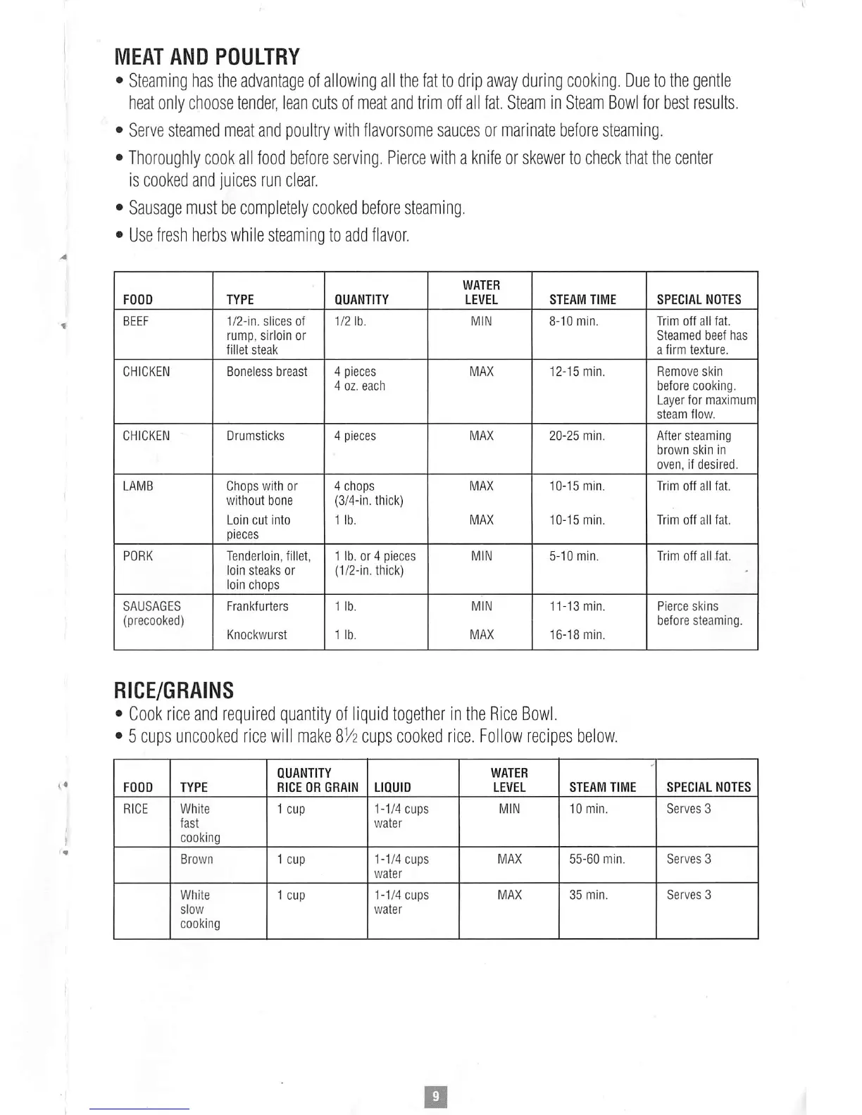 Oster 4714 - Food Steaming Categories; Meat and Poultry Guide; Rice and Grains Guide