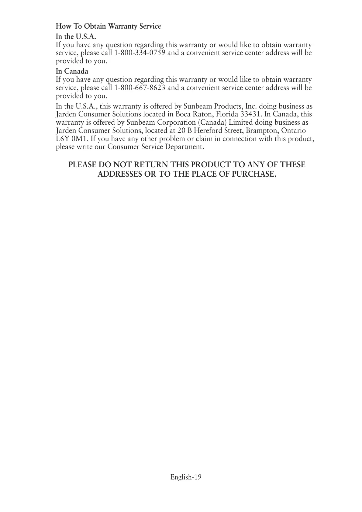 In the U.S.A., this warranty is offered by Sunbeam Products, Inc. doing business as