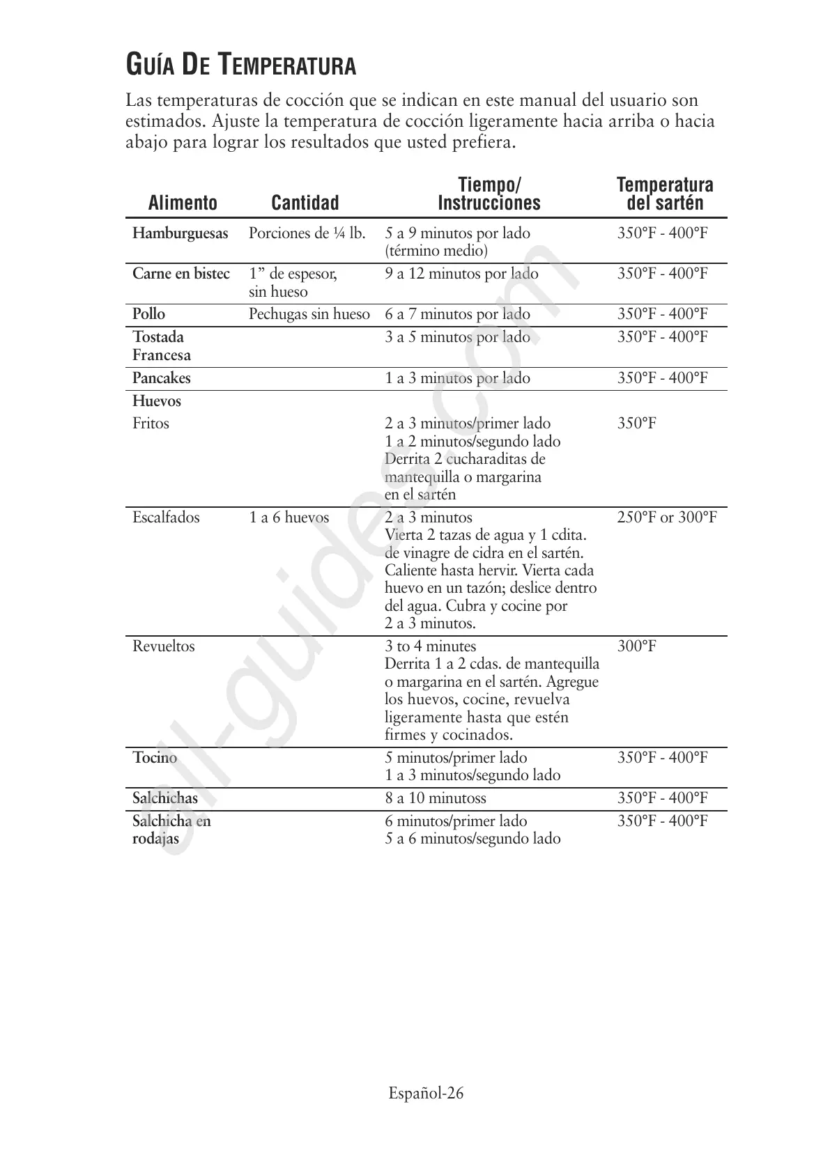 Pancakes 1 a 3 minutos por lado 350°F - 400°F
