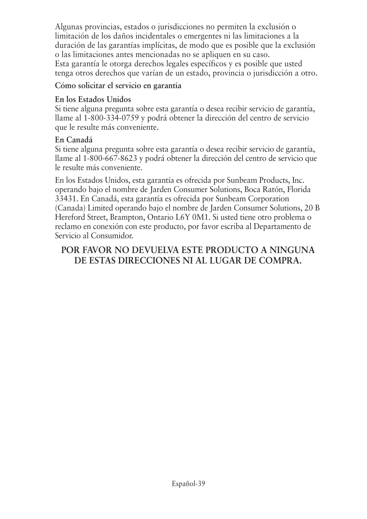 33431. En Canadá, esta garantía es ofrecida por Sunbeam Corporation