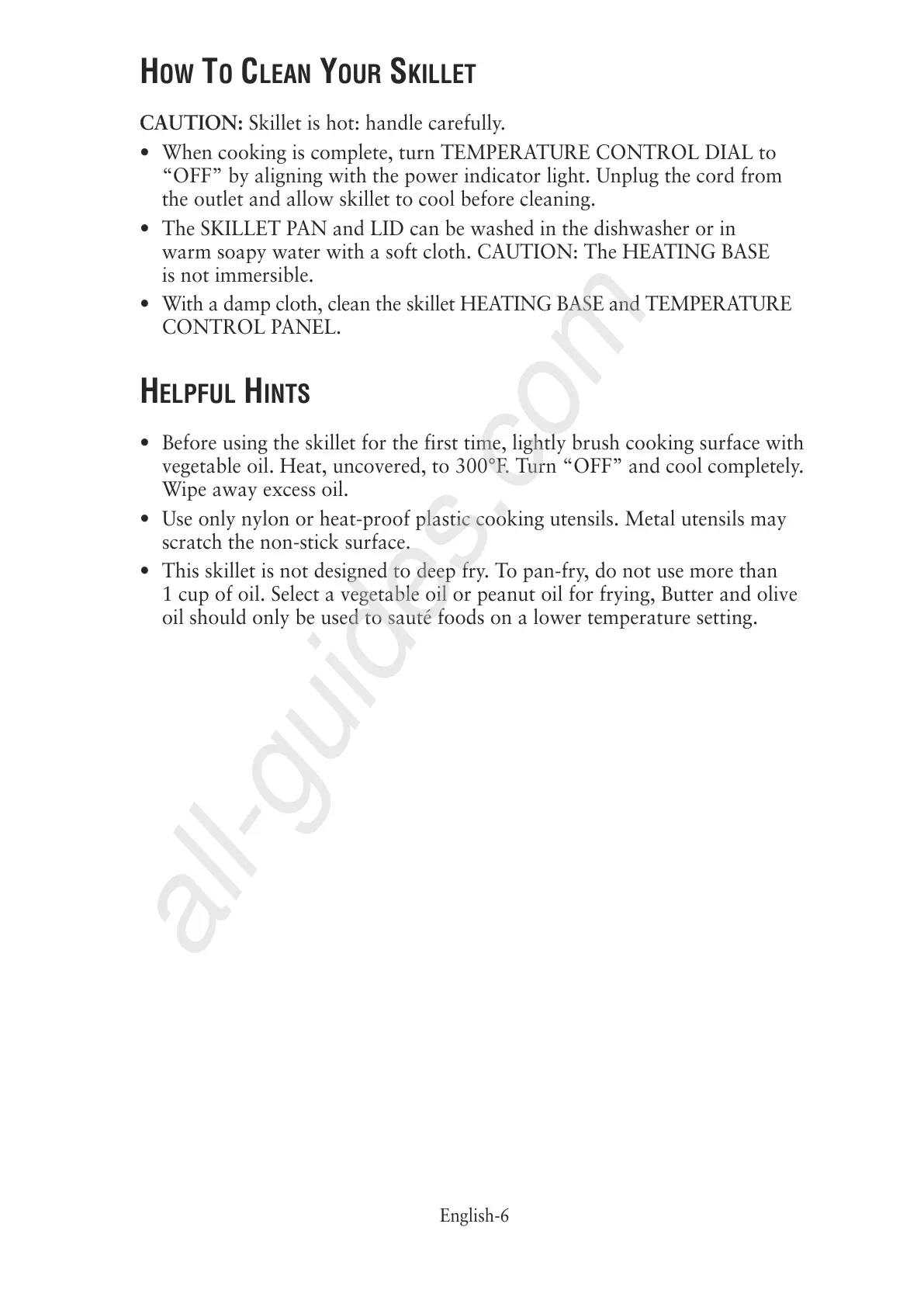 • This skillet is not designed to deep fry. To pan-fry, do not use more than