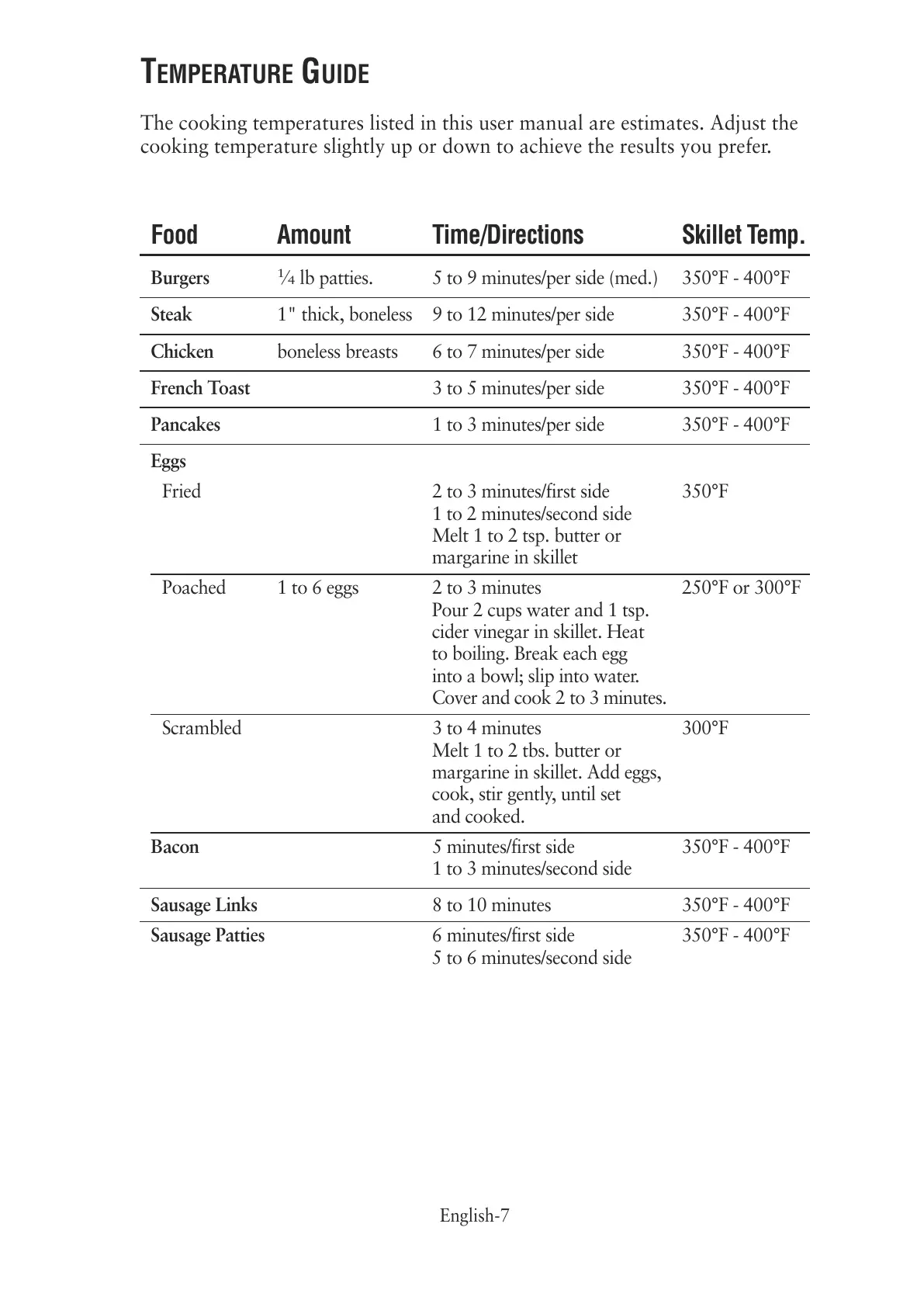 The cooking temperatures listed in this user manual are estimates. Adjust the