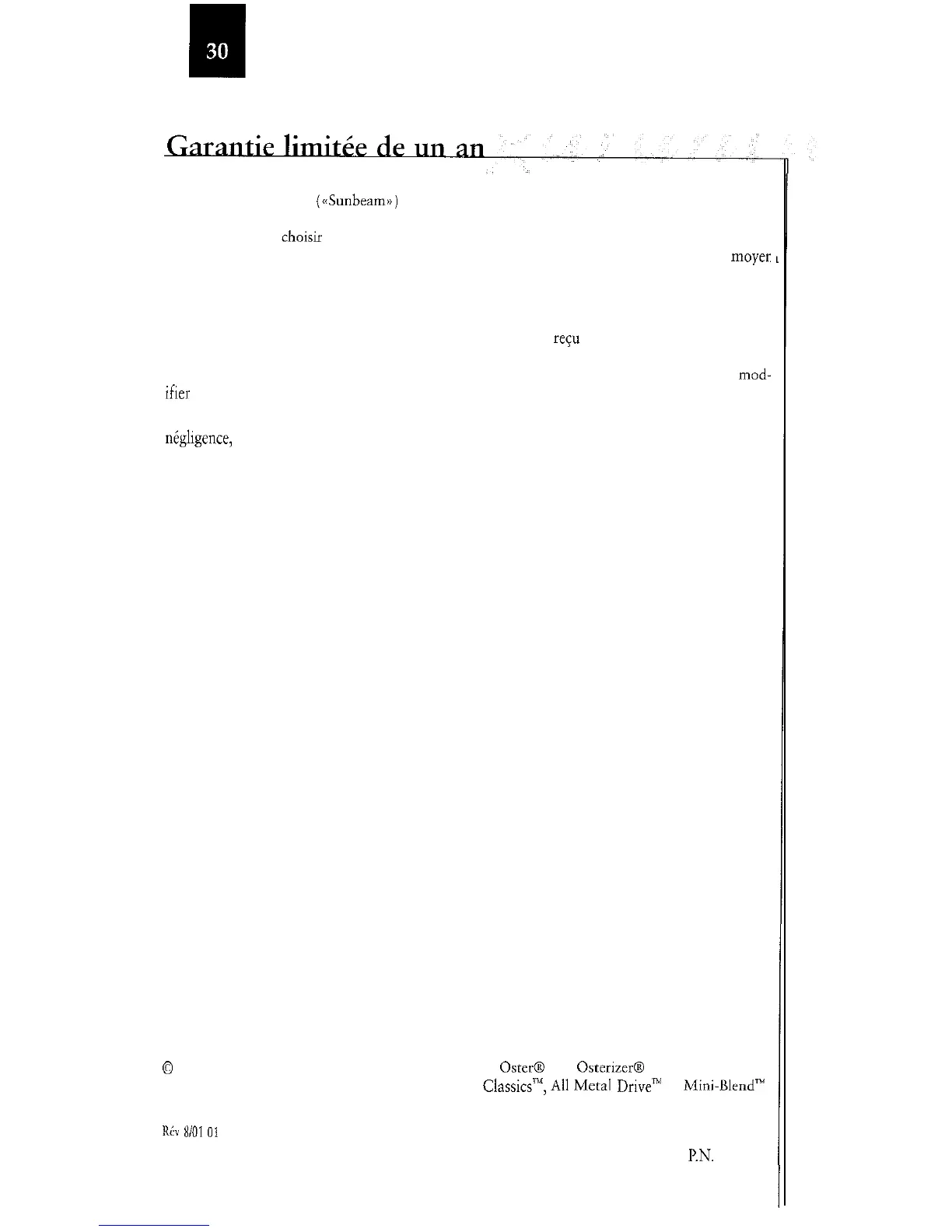 Sunbeam Products, Inc. (&mbeam») garantit cet article contre tout vice de matériau et de