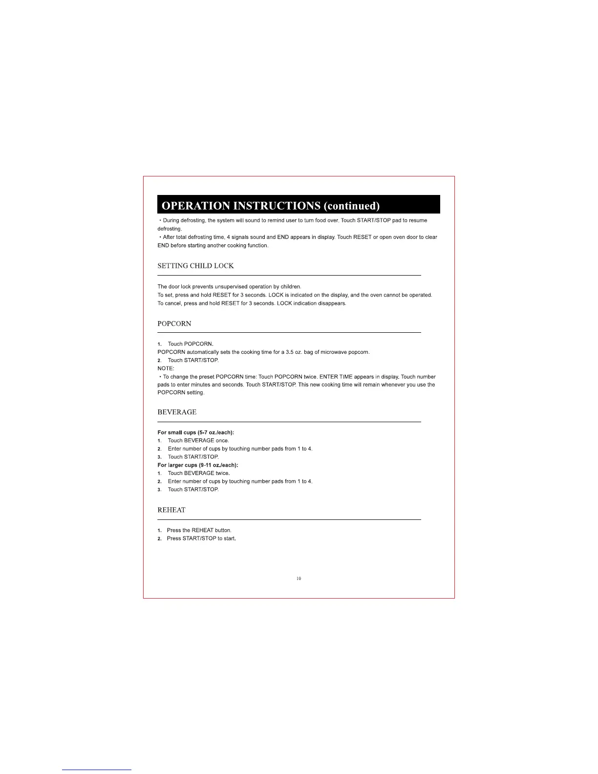 Oster OGS31102 - Setting Child Lock; Popcorn; Beverage; Reheat