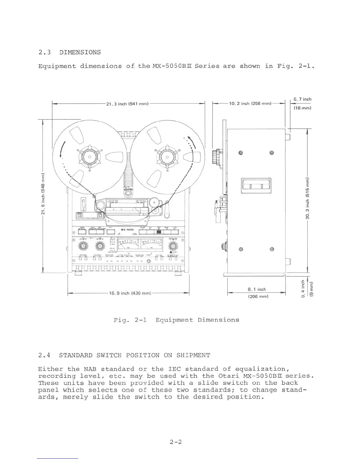 OTARI MX-5050BII - Dimensions; Standard Switch Position on Shipment; Equipment Dimensions