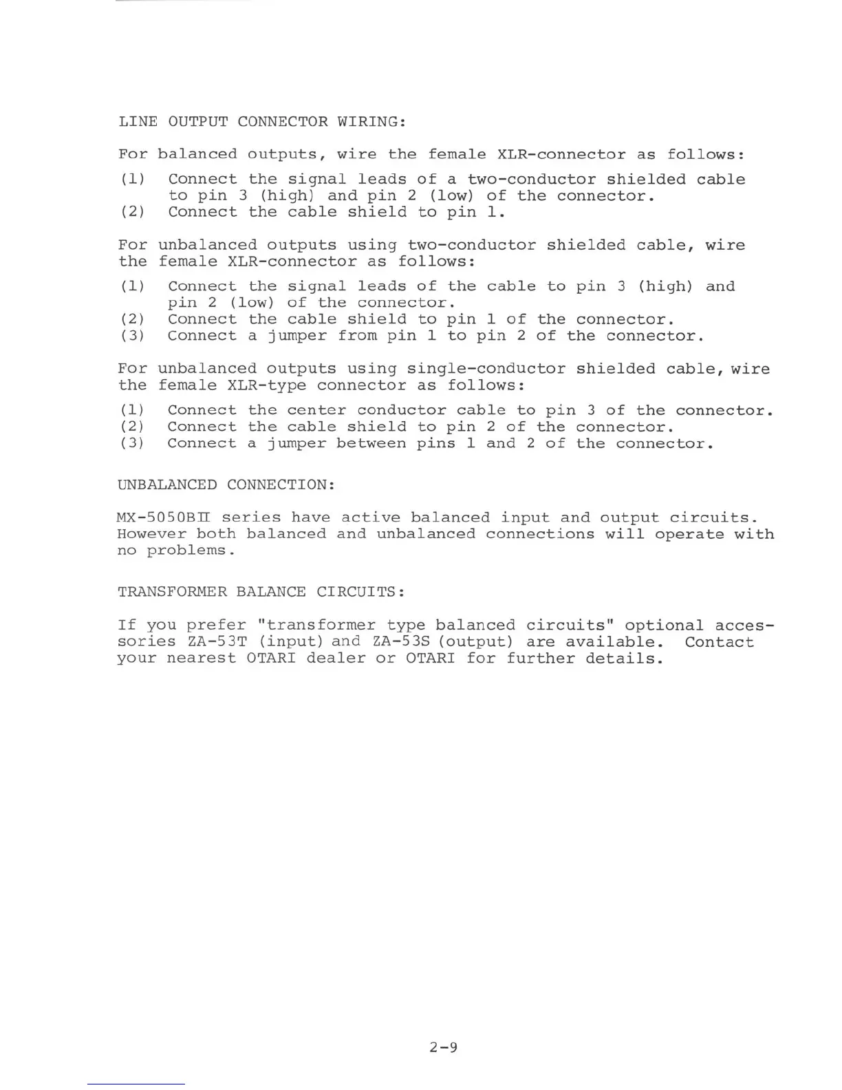 OTARI MX-5050BII - Line Output Connector Wiring; Unbalanced Connection; Transformer Balance Circuits