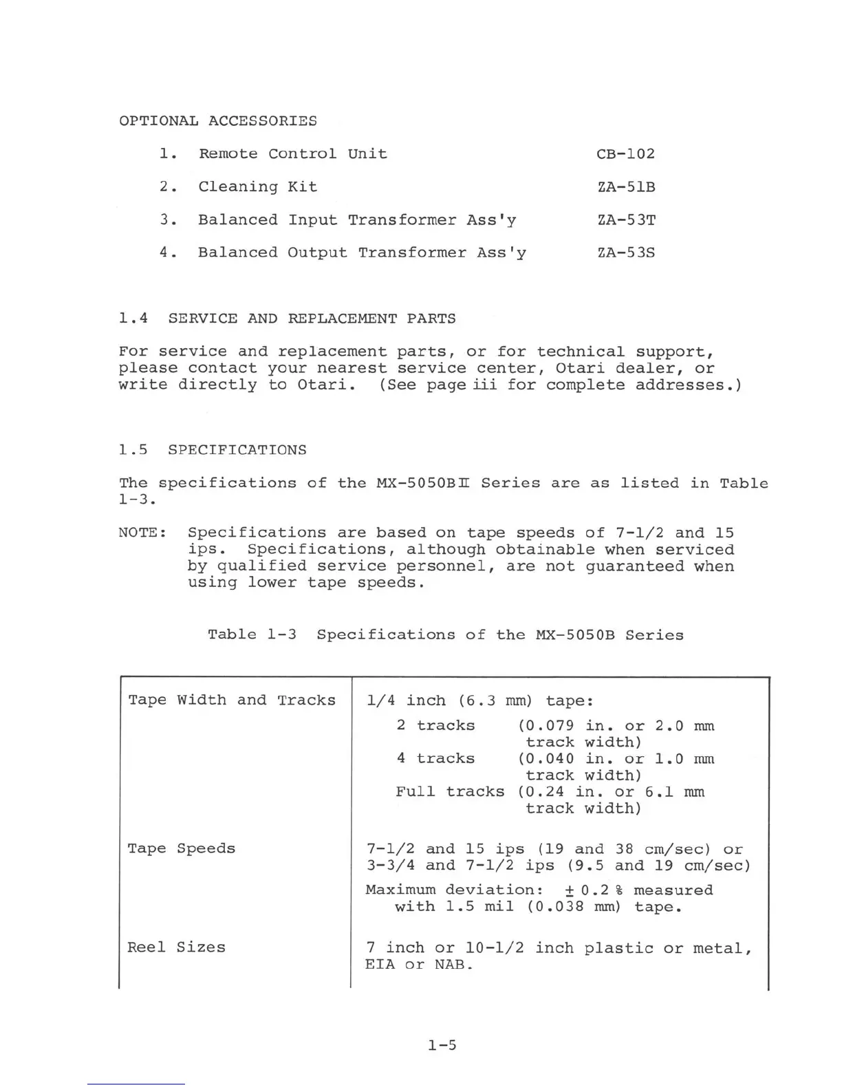 OTARI MX-5050BII - Service and Replacement Parts; Specifications