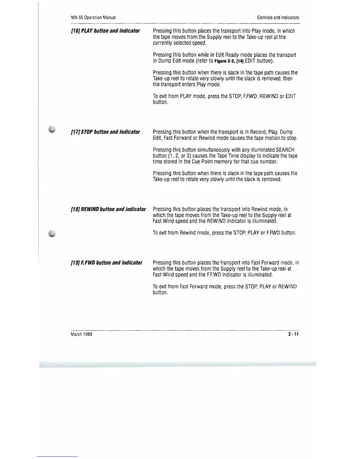 OTARI MX-55T-M - Play Button and Indicator; Stop Button and Indicator; Rewind Button and Indicator; F.fwd Button and Indicator