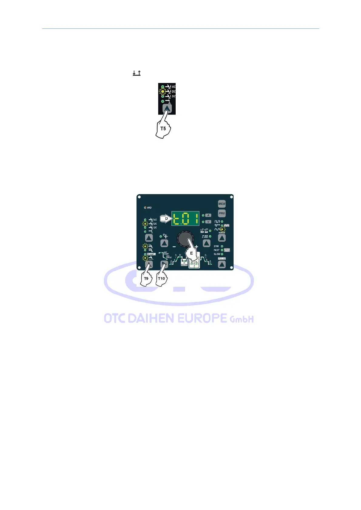 2) Push the SELECT WELDING PROCESS (T5) key and select the TIG DC process, with HF ignition.