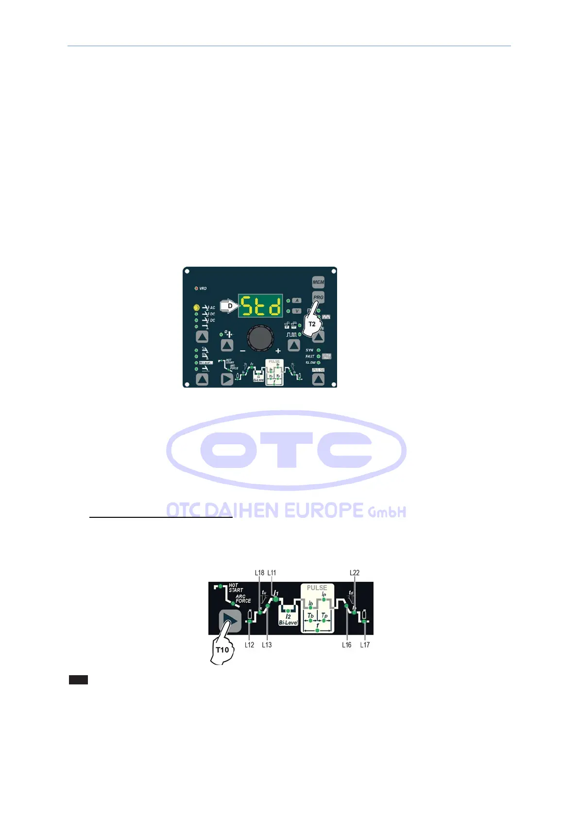 1) When the welding machine is off, push and hold the “PRG” PROGRAM key down (T2).