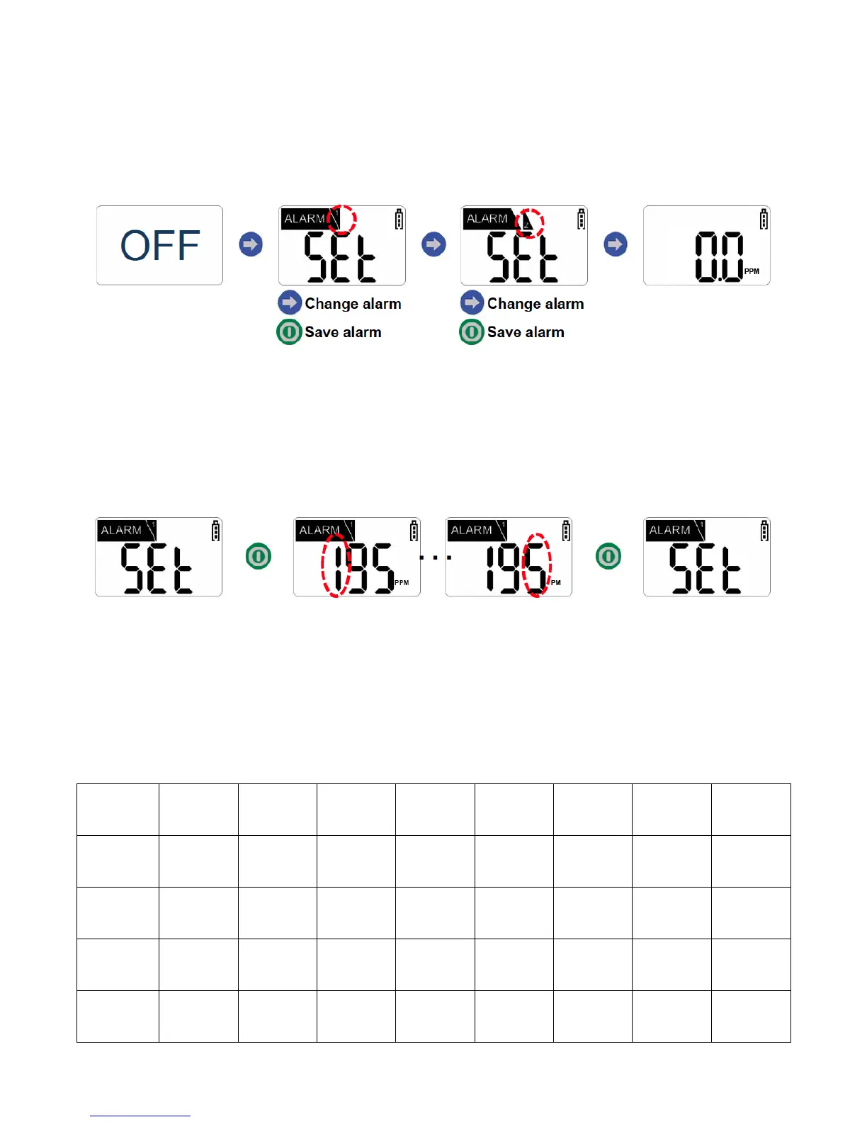 2. To enter Alarm Set Mode, press and hold the blue arrow button for