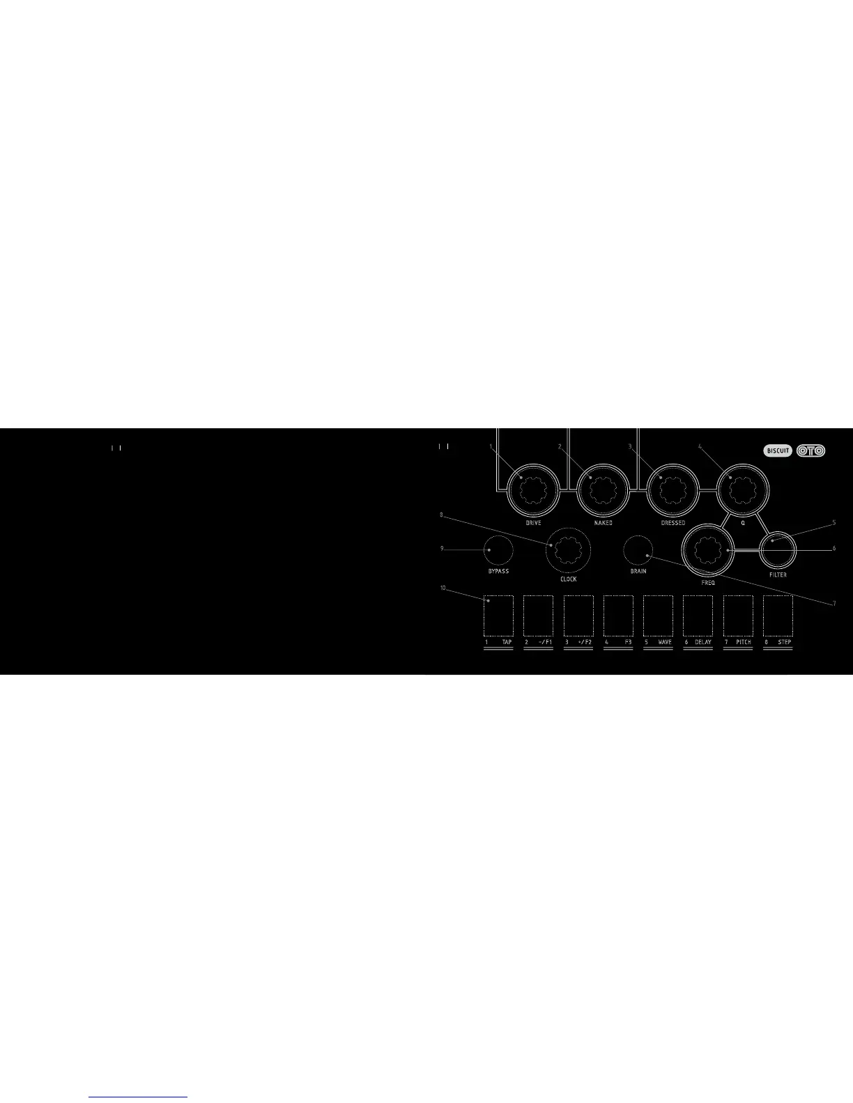 9 BYPASS : True relay bypass. When the switch lights up green, BISCUIT is active. It turns orange when input signal is strong. When its light is off, BISCUIT is
