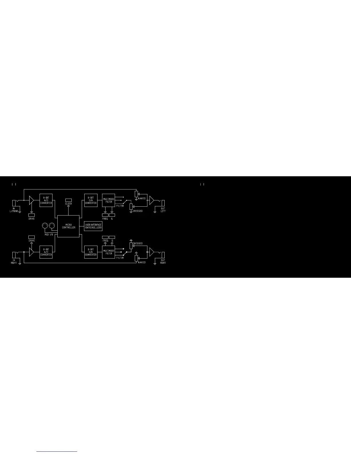 After changing gain by using the DRIVE pot, the sound is converted into an 8-bit digital signal. The sample clock can be adjusted from 250 Hz to 30 kHz. By