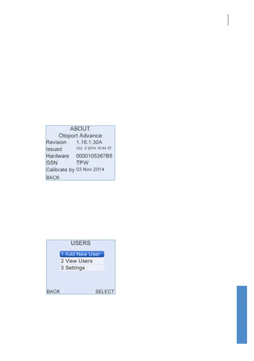 The About screen provides information relating to the Otoport’s