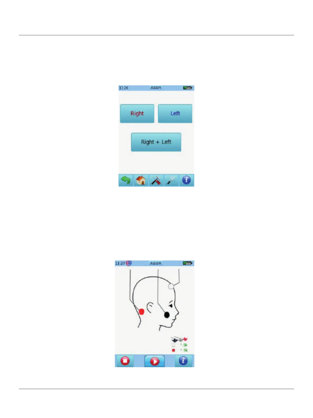 Select the test ear by pressing either the Right or Left button, or Right + Left for binaural testing. Binaural