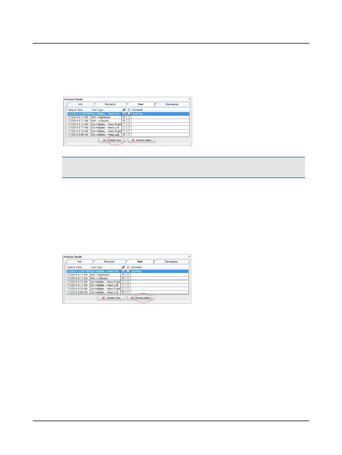 To delete the video(s) for a selected test, click Delete Video. For more information about selecting a test, refer to Select-