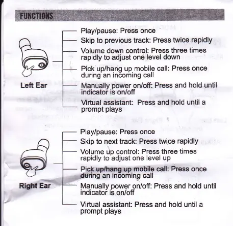 Otto TW300 - Earbud Functions and Controls; Left Ear Control Functions; Right Ear Control Functions