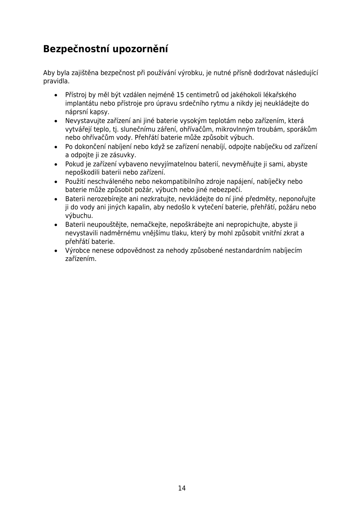 ji do vody ani jiných kapalin, aby nedošlo k vytečení baterie, přehřátí, požáru nebo