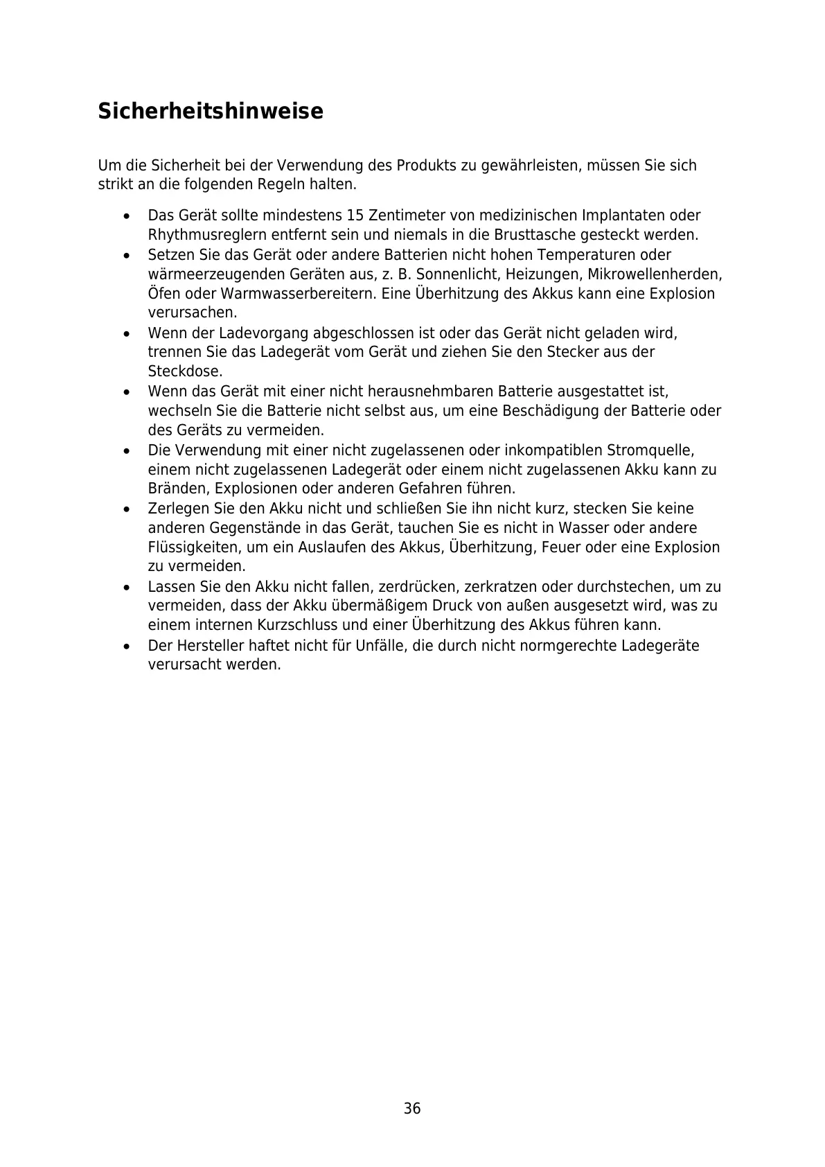 Der Hersteller haftet nicht für Unfälle, die durch nicht normgerechte Ladegeräte