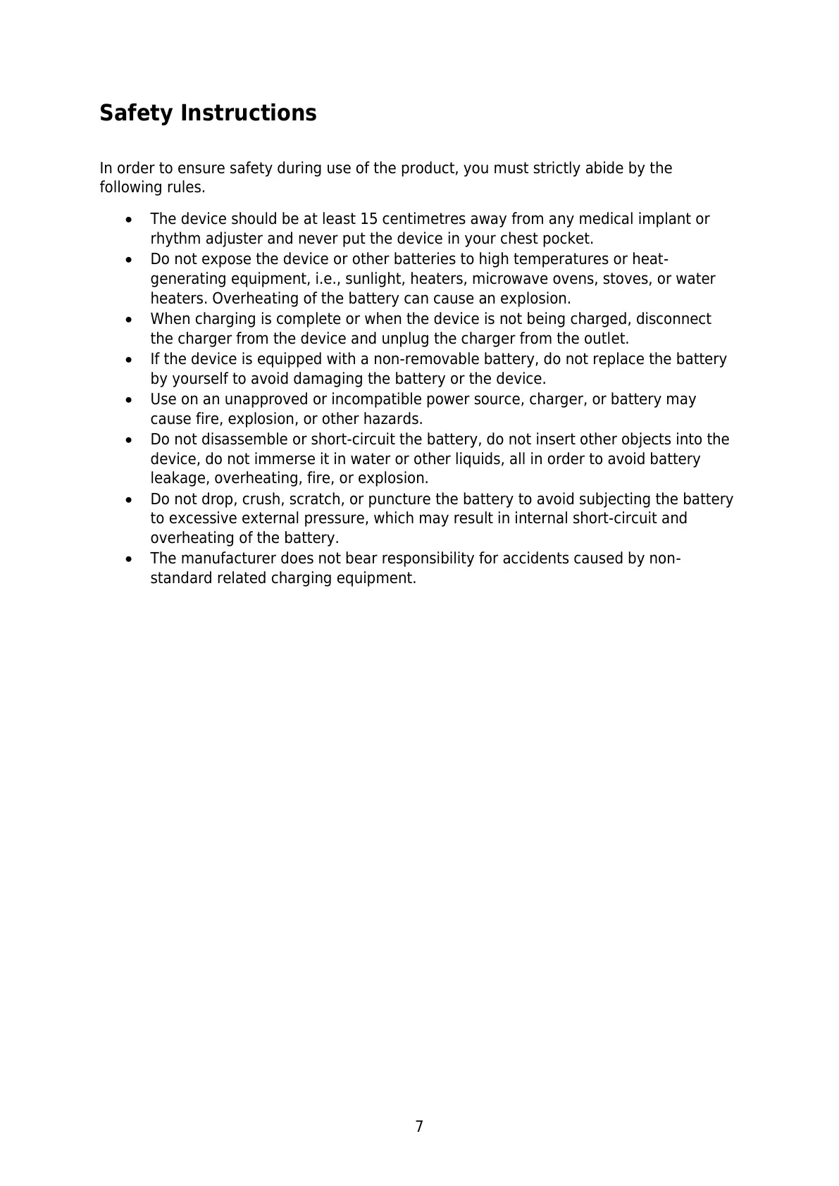 device, do not immerse it in water or other liquids, all in order to avoid battery