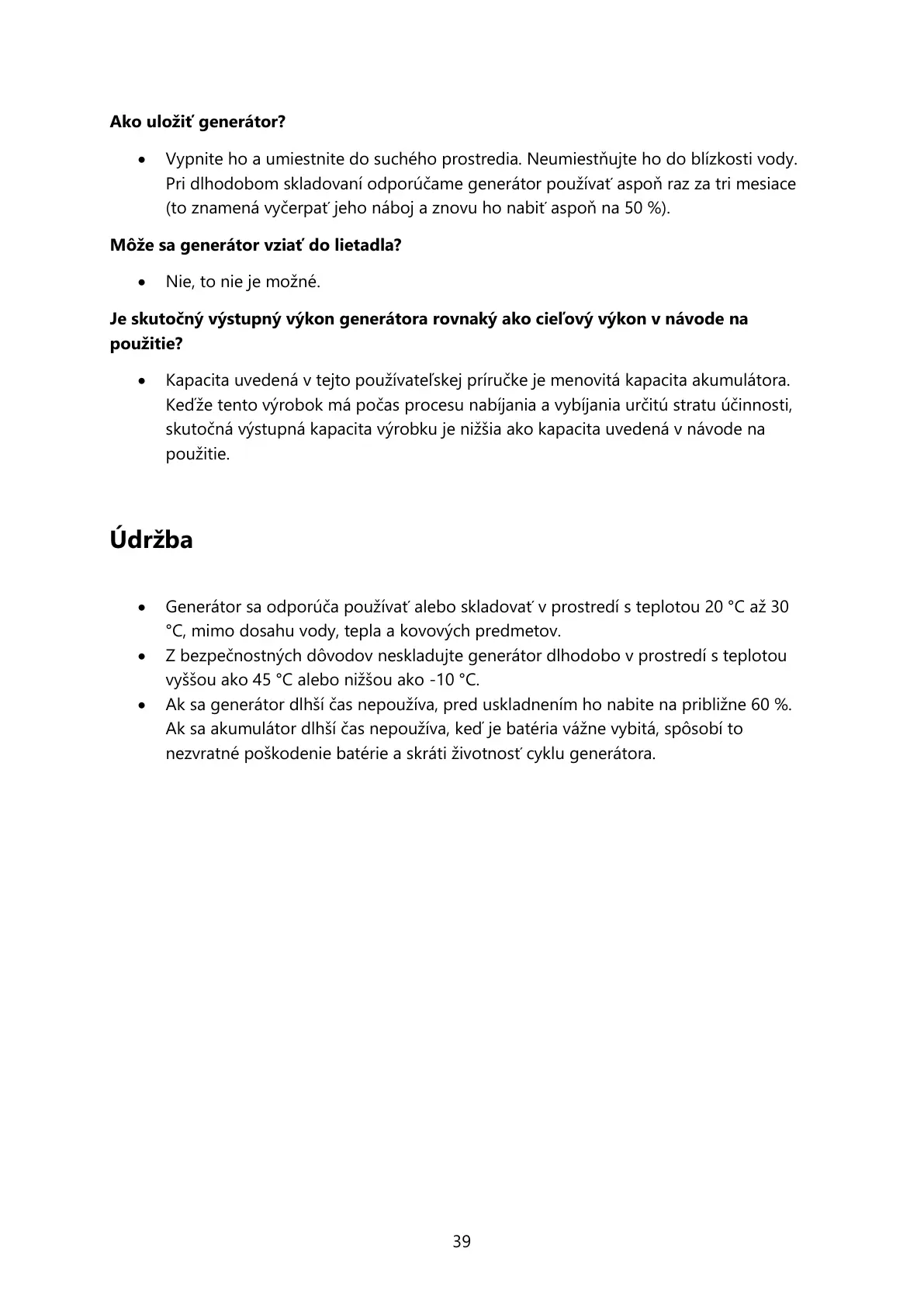 Ak sa generátor dlhší čas nepoužíva, pred uskladnením ho nabite na približne 60 %.