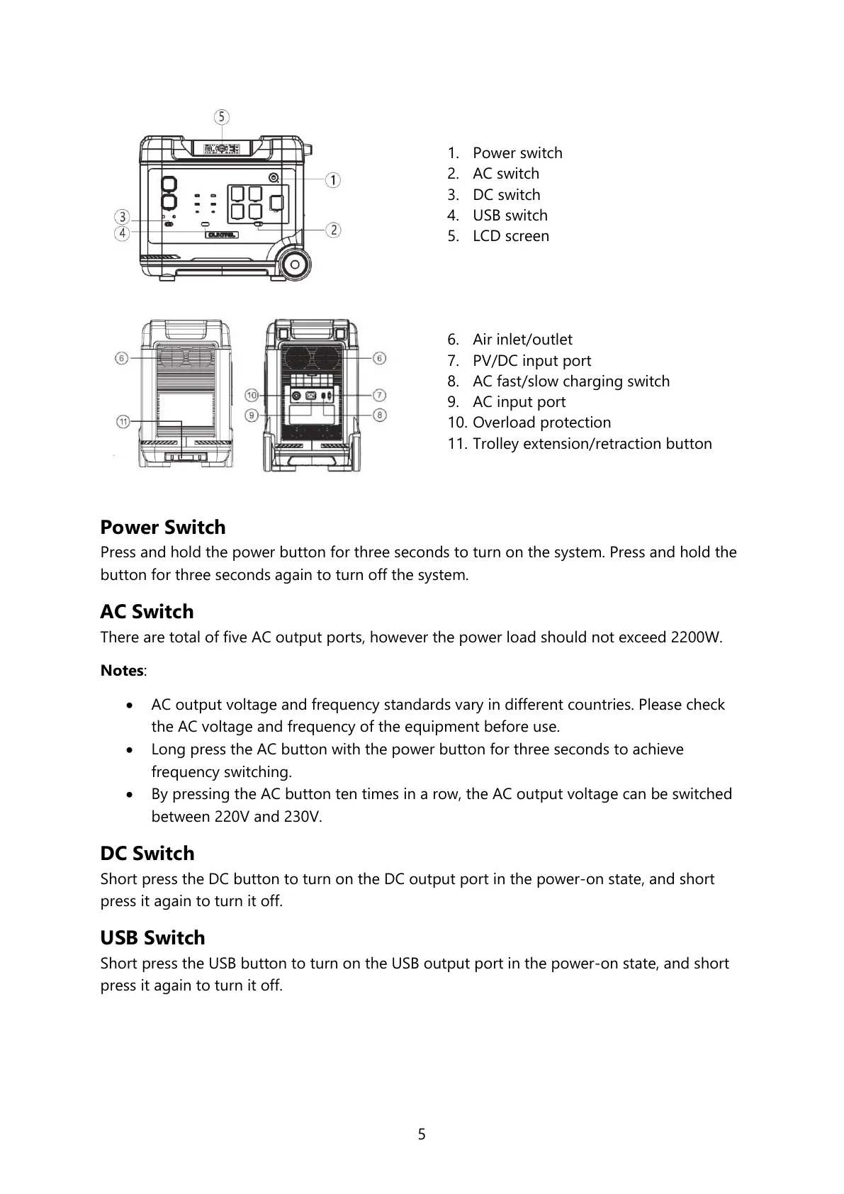 There are total of five AC output ports, however the power load should not exceed 2200W.