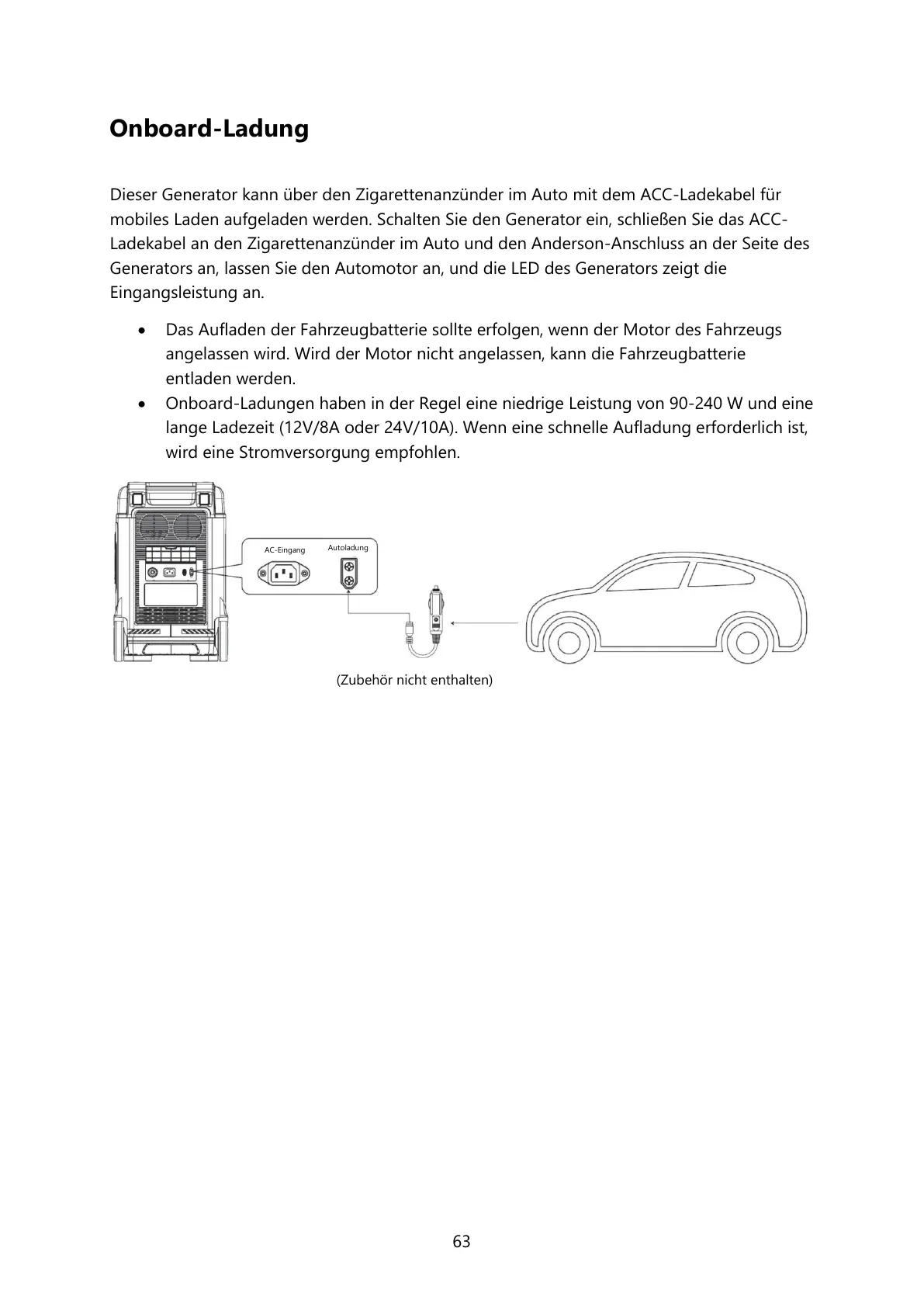 mobiles Laden aufgeladen werden. Schalten Sie den Generator ein, schließen Sie das ACC-