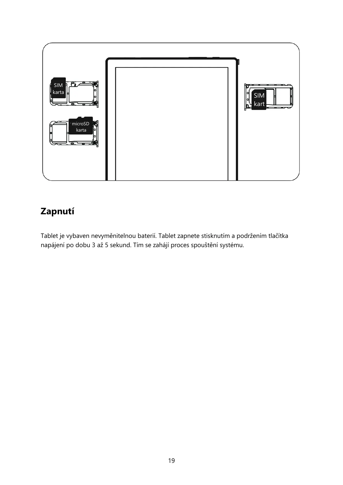 Tablet je vybaven nevyměnitelnou baterií. Tablet zapnete stisknutím a podržením tlítka