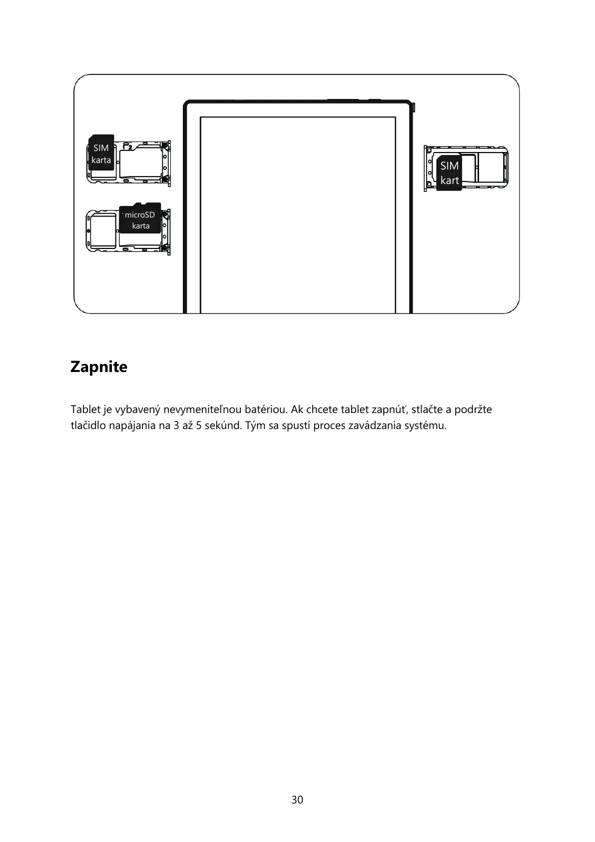 Tablet je vybavený nevymeniteľnou batériou. Ak chcete tablet zapnúť, stlačte a podržte