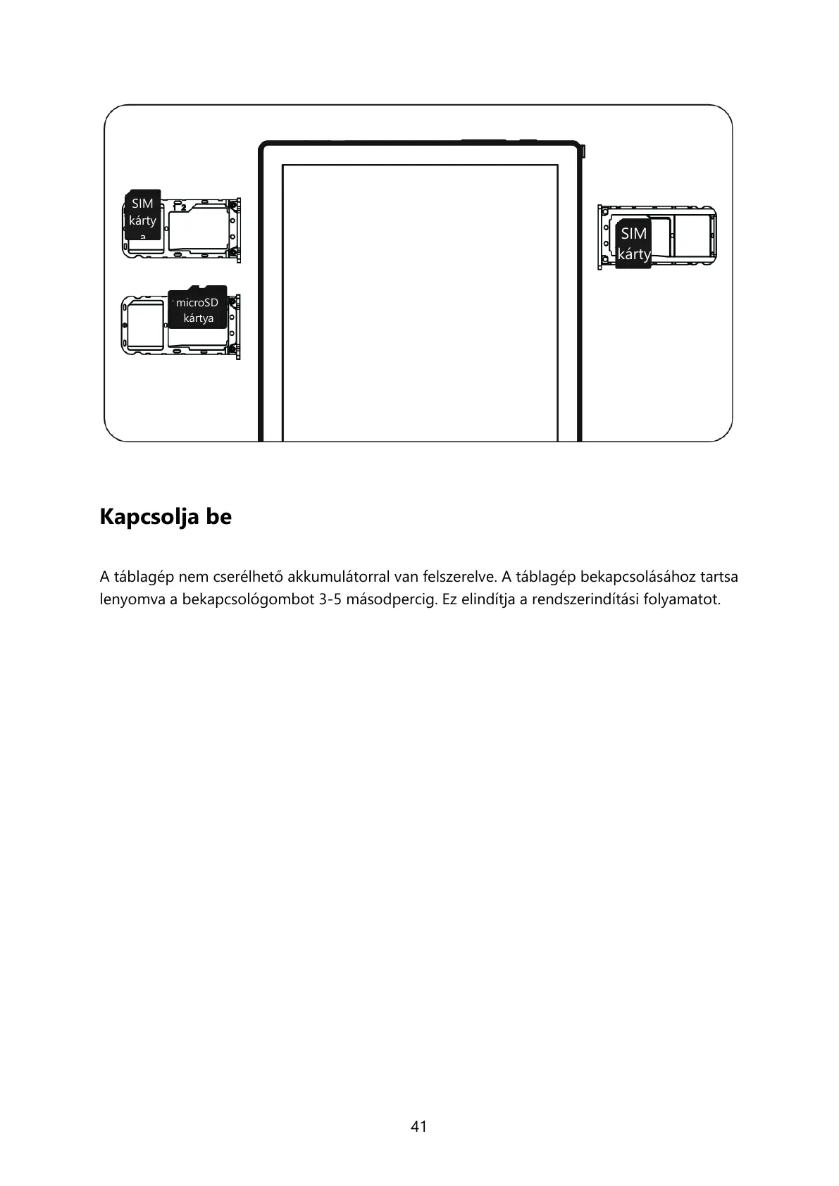 A táblagép nem cserélhető akkumulátorral van felszerelve. A táblagép bekapcsolásához tartsa
