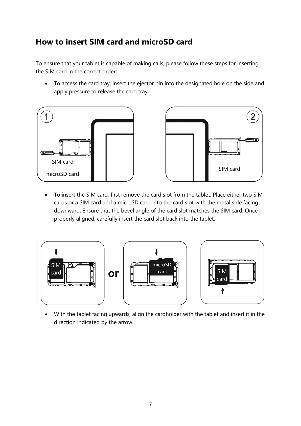To insert the SIM card, first remove the card slot from the tablet. Place either two SIM