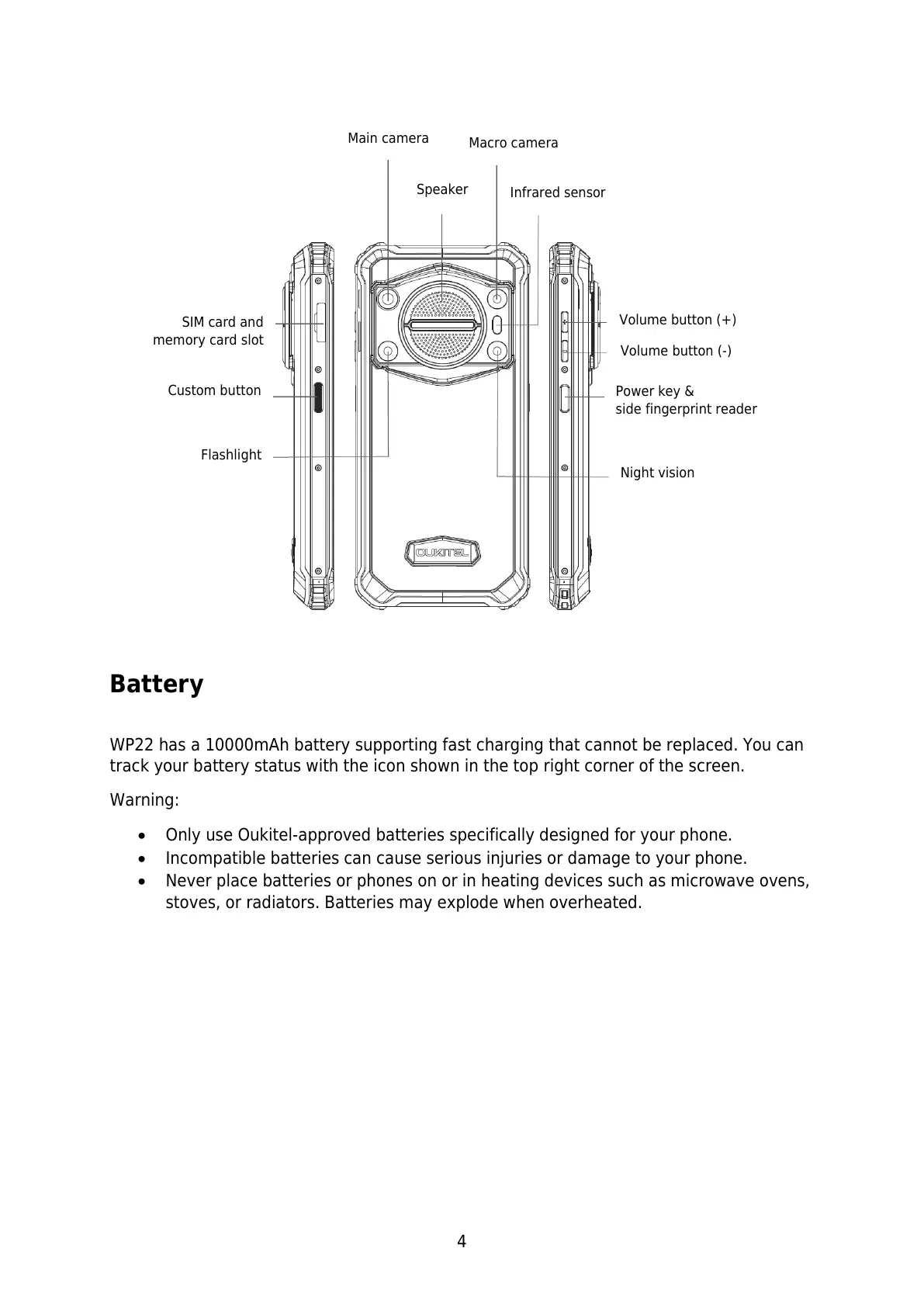 WP22 has a 10000mAh battery supporting fast charging that cannot be replaced. You can