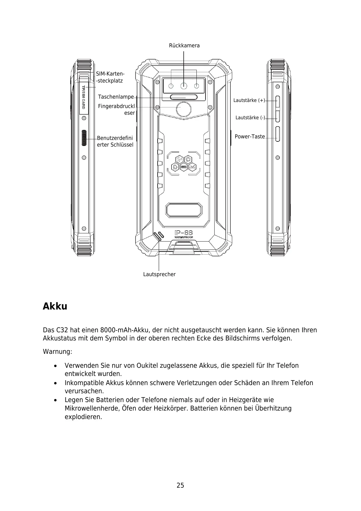 Verwenden Sie nur von Oukitel zugelassene Akkus, die speziell für Ihr Telefon