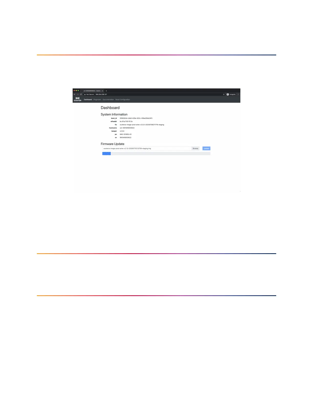 Sensor firmware can be updated with an Ouster-provided firmware file from