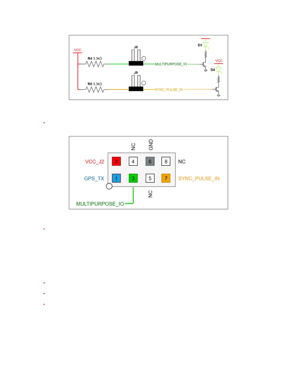 8 - 0.1” pitch, 4x2 pin header J7. GPS_TX (Pin 1) is only connected to connector J2; it is not