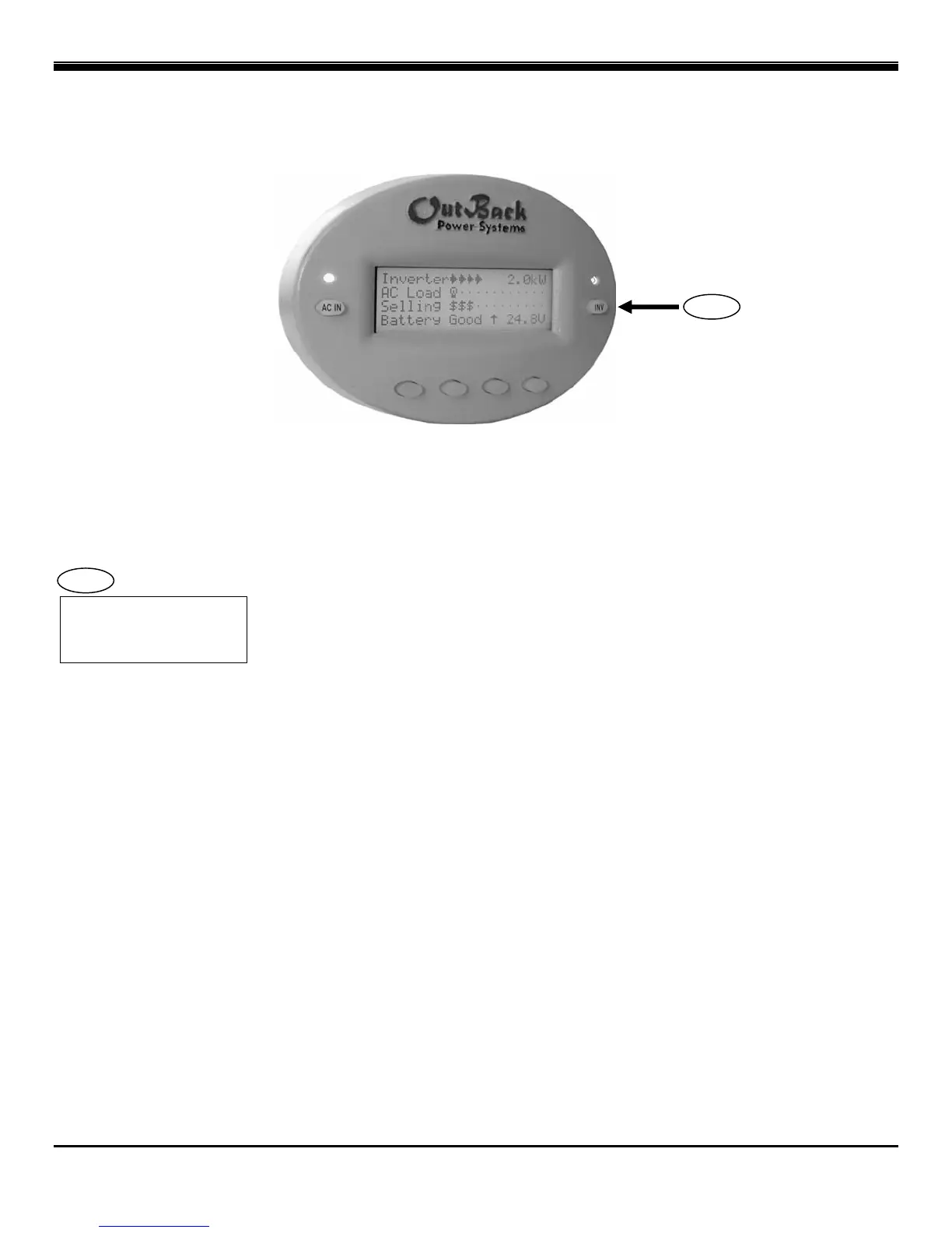 The OutBack MATE includes an INV “hot” key to allow direct control of the inverter from anywhere in the menu system. The INV key is