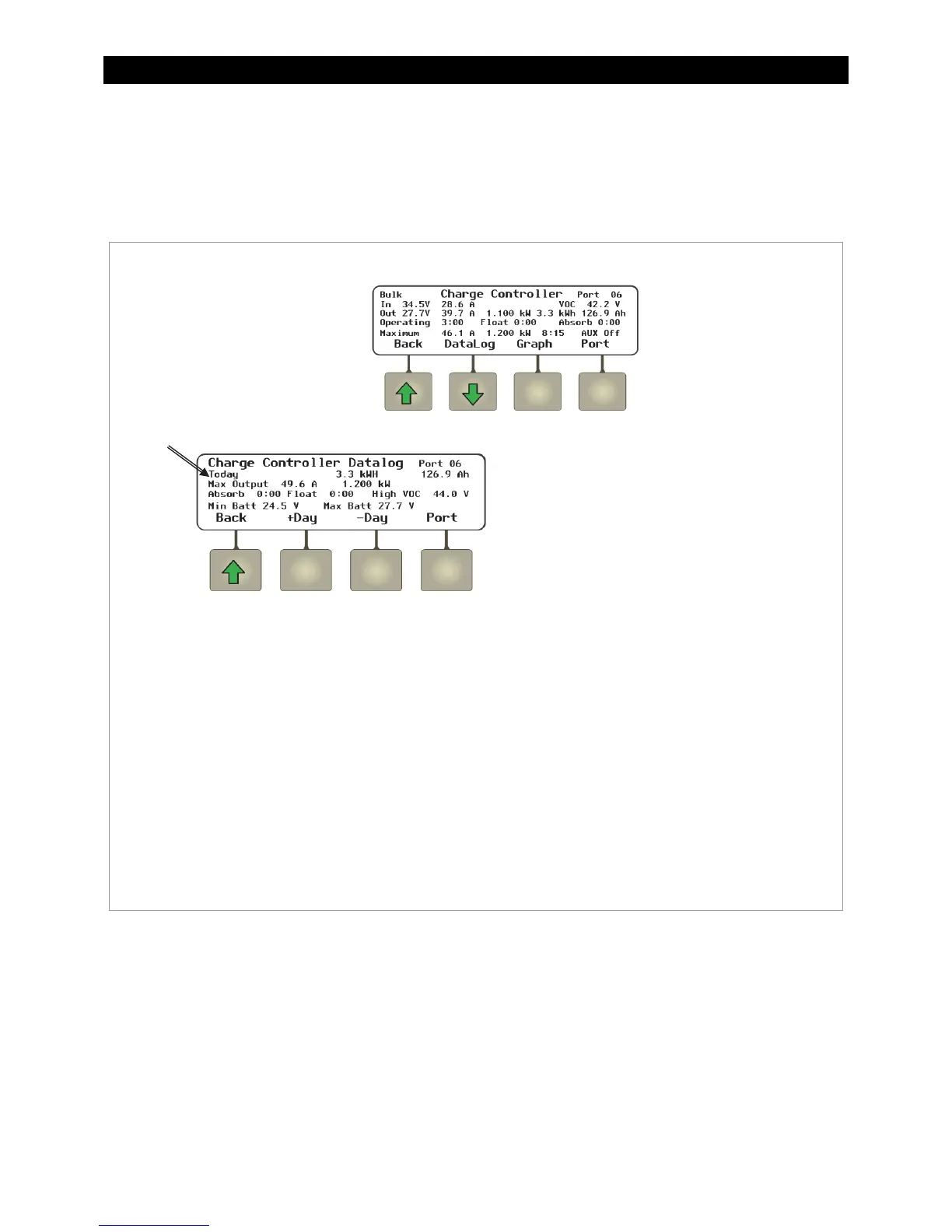 The <DataLog> soft key shows accumulated daily amp-hour and watt-hour statistics, as well as