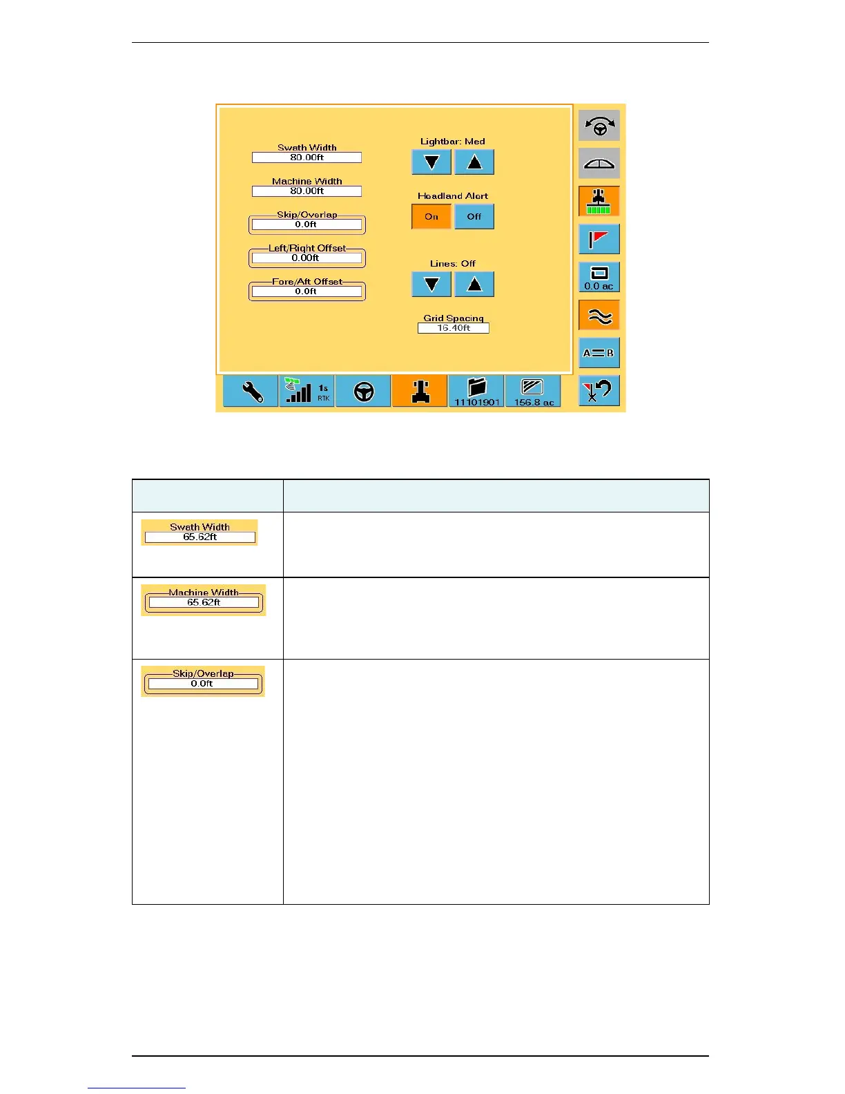 Width of the vehicle or implement for the current job. Touch this