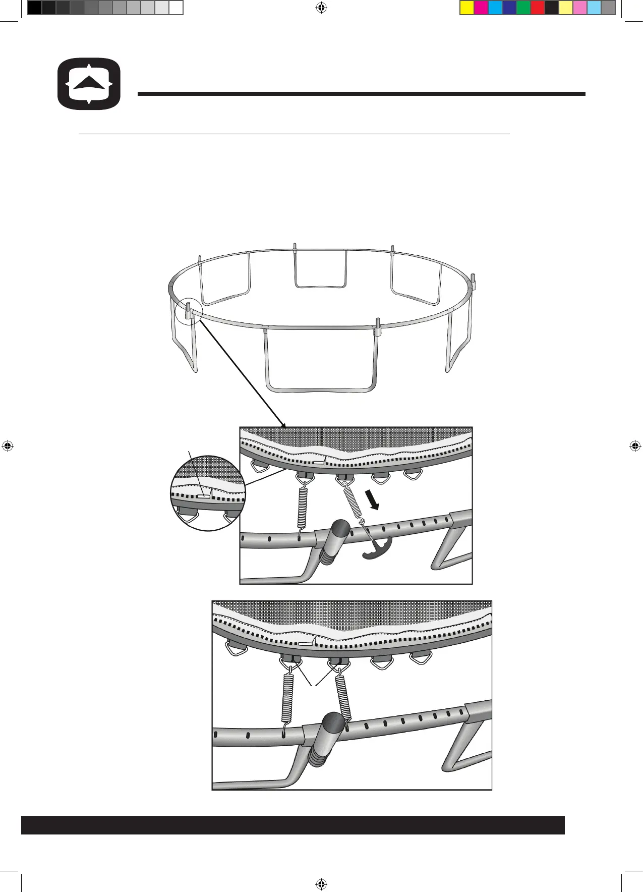 • Hang the Trampoline Mat (10) on the Top Rail Frame using the